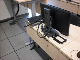 An image of the monitor with HDMI cable around it's back. The instructors desk is the raised desk on the left: